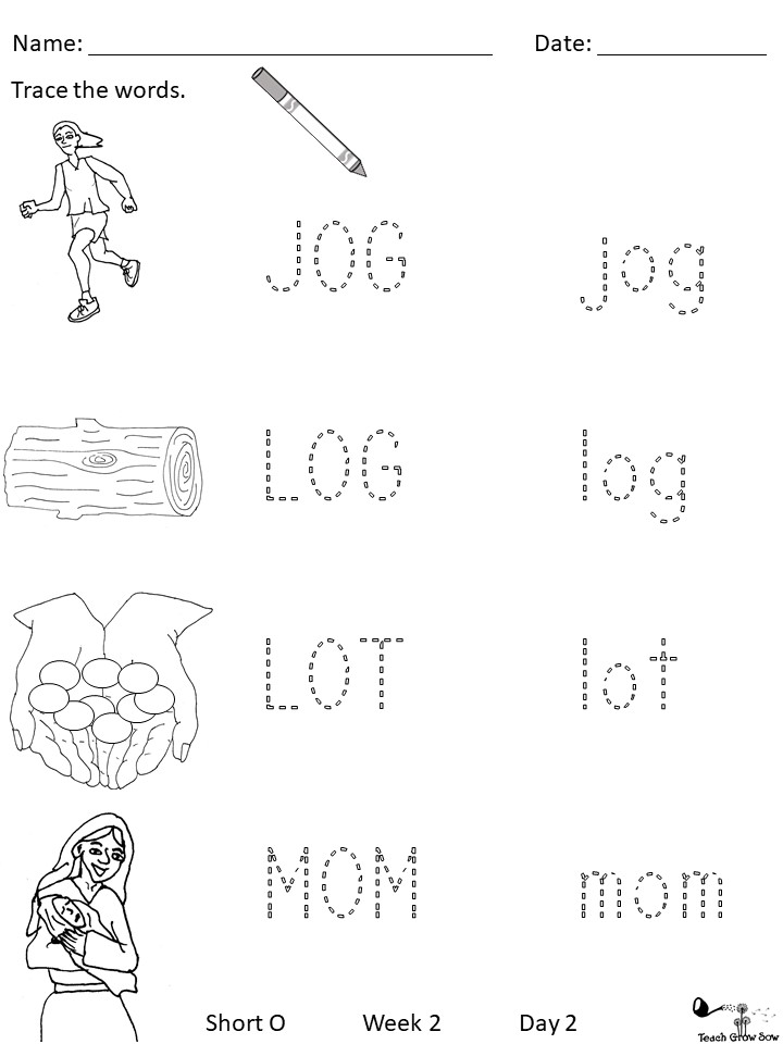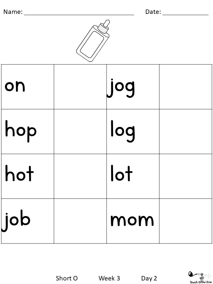 Free, printable short O phonics worksheets for four weeks of daily lessons.