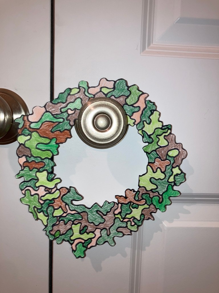 Make this camo wreath for Veteran’s Day. Print this template, have children color sections at least two colors of green and at least two colors of neutral. Try to avoid having any color border itself.