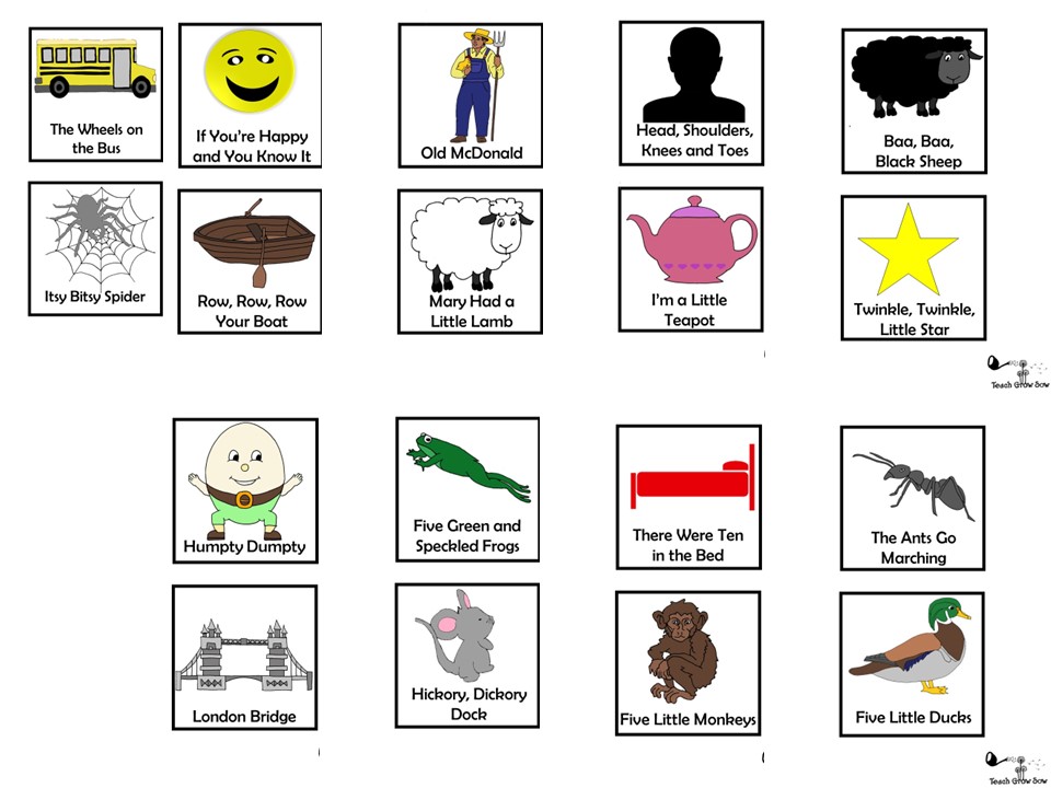 Buy three 4″x4″ cardboard boxes at a craft store and print these pictures onto full-size page labels. Put six of the nursery rhyme songs on two of the dice and the six counting songs on the other. Let children toss each one to choose songs for your morning circle time each day.