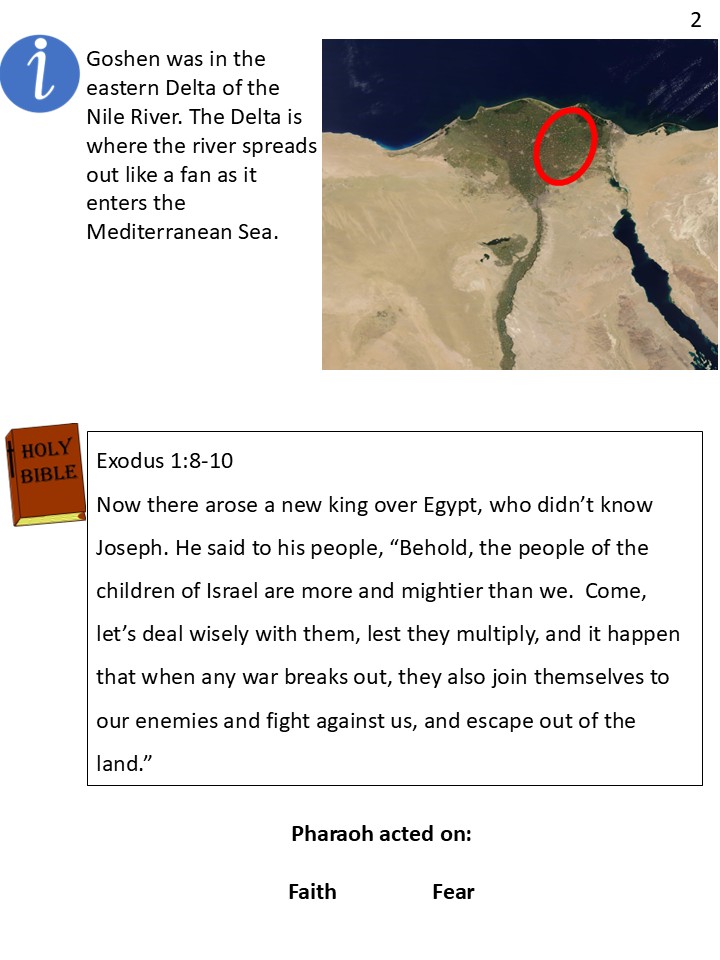 After everyone in Joseph’s generation had died, a new pharaoh took the throne. He did not remember how Joseph had saved Egypt from famine. All he could see were people who were different from the Egyptians. He was afraid that there were too many of them and he did not trust them to be loyal to Egypt. So, he decided to force them to do hard work for the Egyptians with just enough food and supplies to survive.