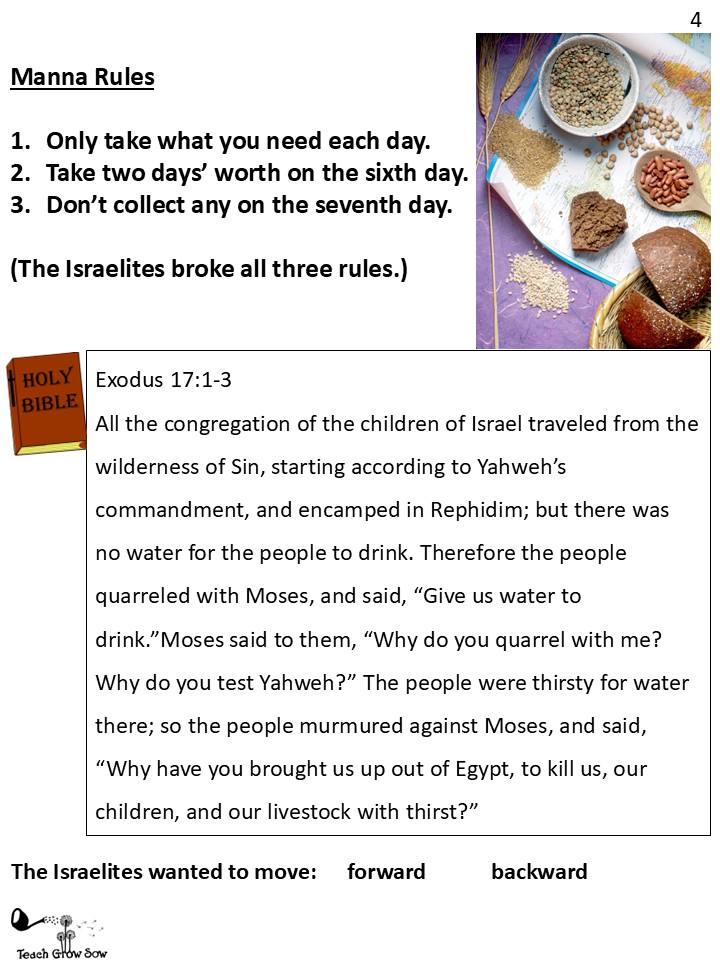 Moses told the people they had to show their faith in God by only taking what they needed for the day and waiting until the next morning to collect more. But some of the Israelites disobeyed, waking the next morning to the nauseating smell of rotting Manna, disgusting-looking and covered in worms. The only day God allowed them to collect more than a day’s worth was the day before the Sabbath, their day of worship, because He wanted them to rest the next day.