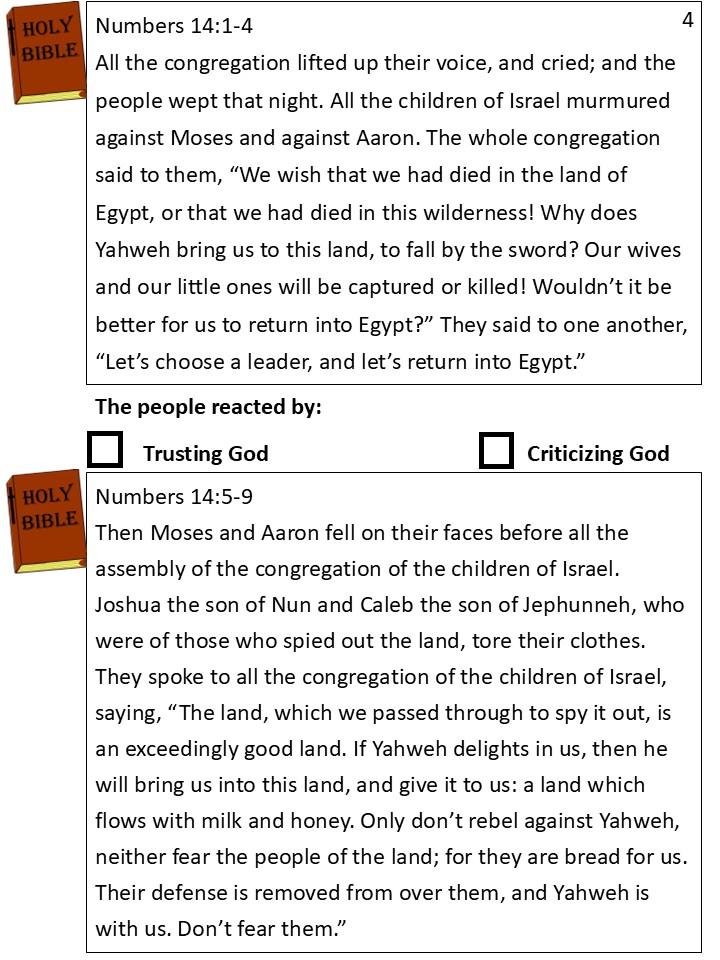 “Wait!” Caleb cried out. “Why are you panicking? If God told us this is where we’re supposed to live, obviously He will keep us safe here.”