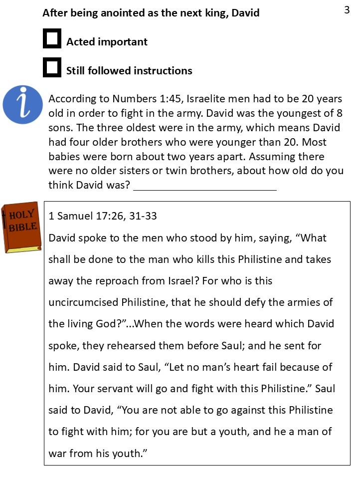 “Come!” his father Jesse called him over. “Take this bread and cheese to your brothers in the army. And try to get some information about how things are going. I’m so worried about them!”