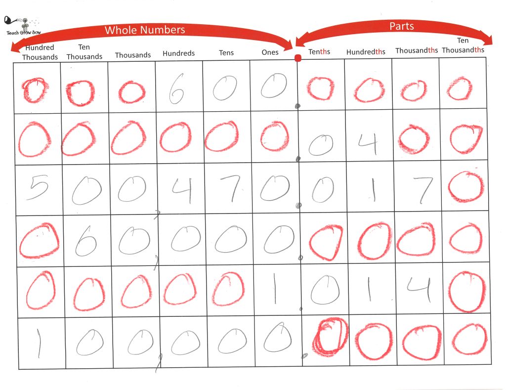 Do your students struggle to remember when zeros have no purpose? Try this activity. Print the template above and have students write digits in a pointy new pencil. Then, have them fill in extra zeros with a dull crayon. Explain that only zeros between largest whole number and the decimal point, or the smallest part and the decimal point, are relevant. All other zeros are “pointless” in the sense that they don’t change the value of the number (but are helpful for lining up numbers properly).