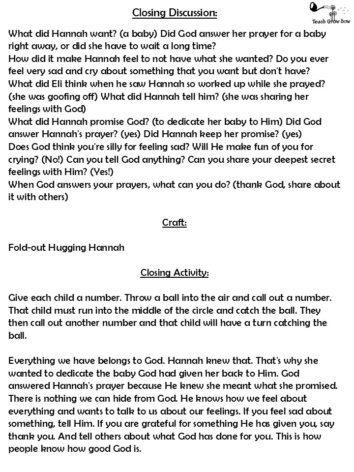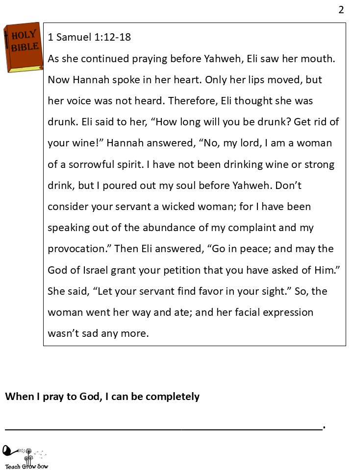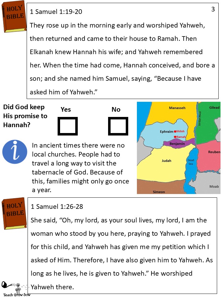Hannah and Elkanah had three more sons and two daughters. They stayed at home, learning how to farm like their family and neighbors, but Samuel studied how to serve God at the Lord’s house in Shiloh.