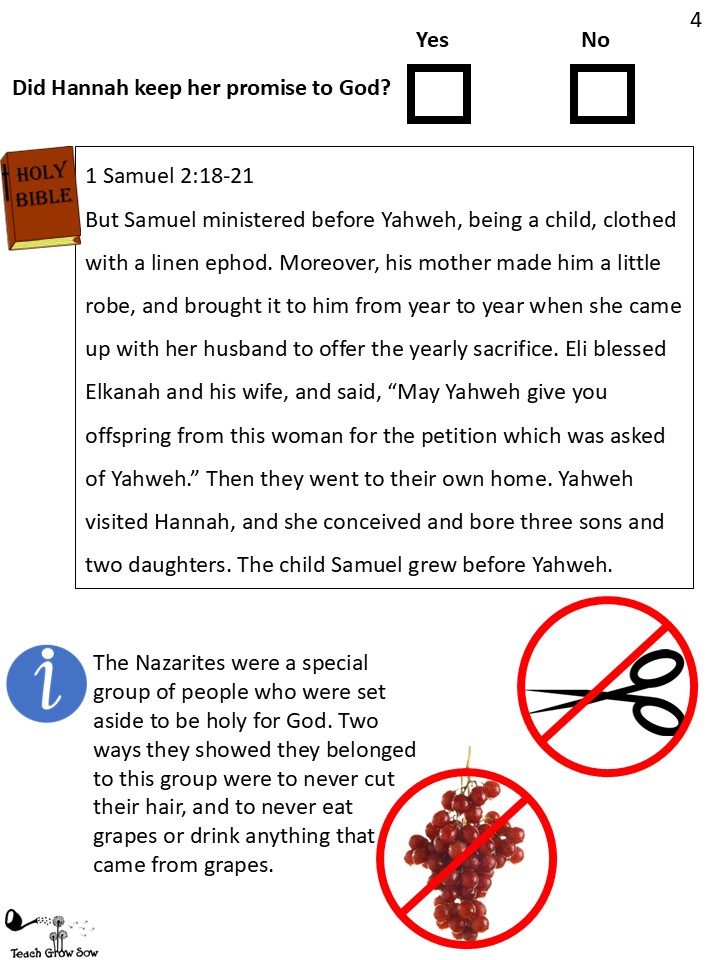 Hannah promised to have her son belong to a special group of people who served God and showed their commitment by never cutting their hair or tasting any kind of grapes. These were both symbols that showed others who they were.