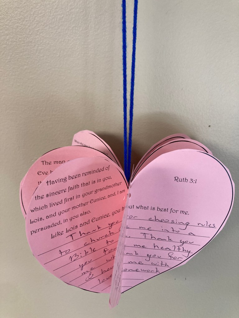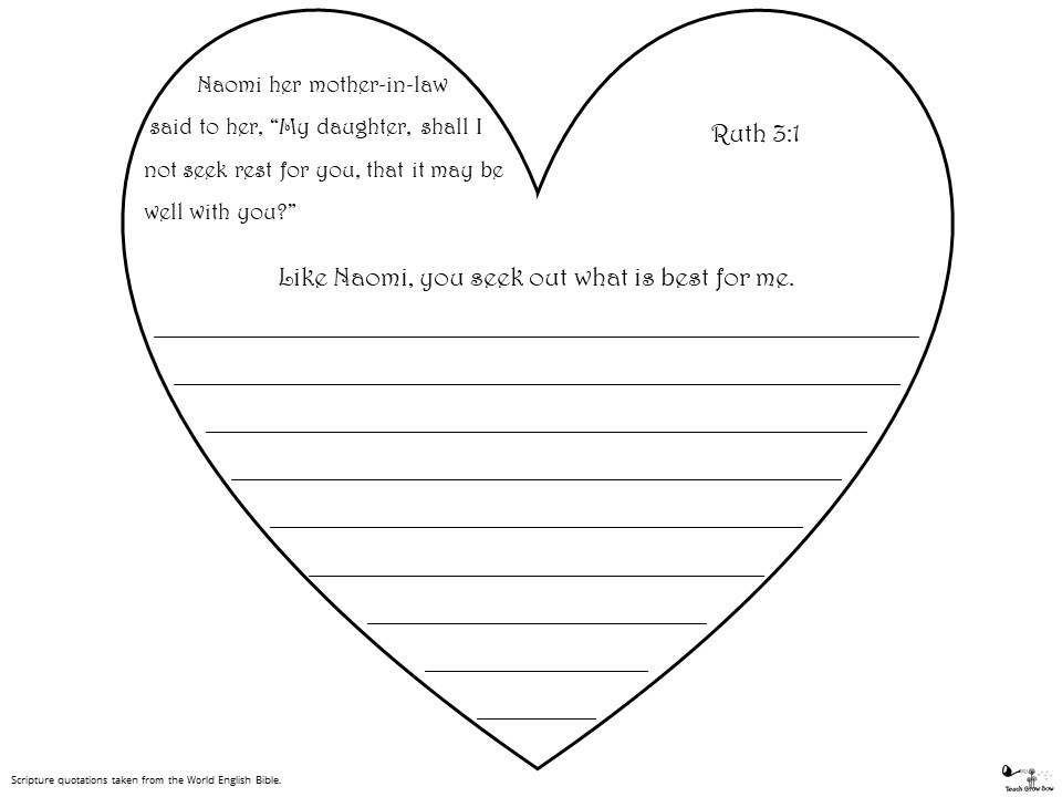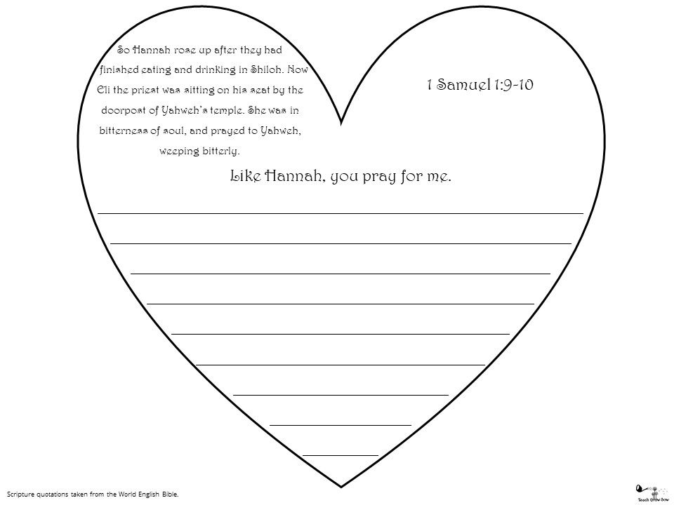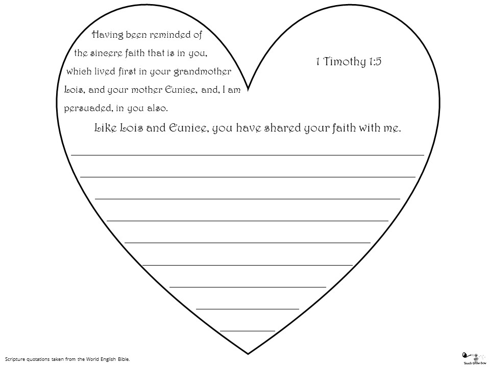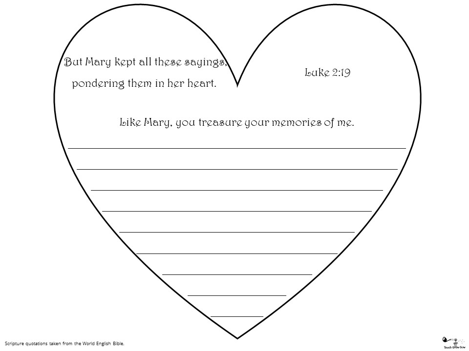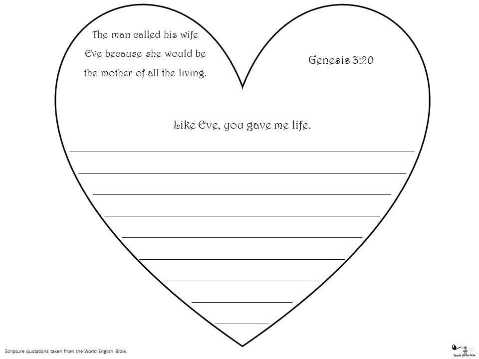 Have children learn about some of the more famous mothers of the Bible, then write an example of ways their moms share some qualities with them. You can cut out each heart to make a heart-shaped book; or hole punch the center, glue heart-halves back-to-back, and then string a ribbon through the holes to make a hanging decoration.