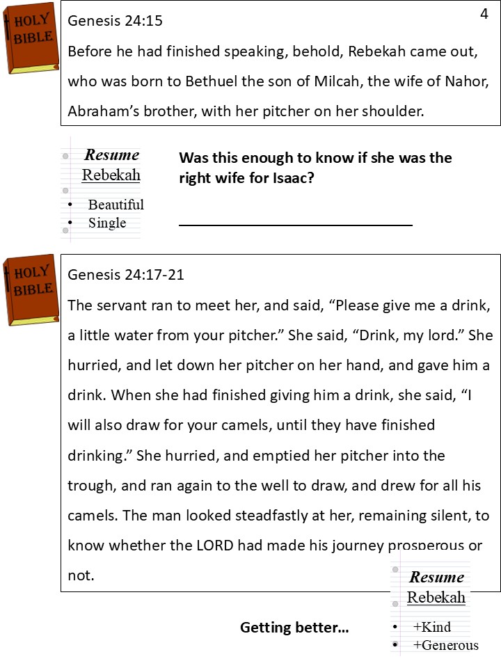 When Abraham’s servant got there, he let the camels rest near the well outside the city. It was late in the afternoon, the time when the women came out for water. How would he know which woman he was supposed to ask to come with him?