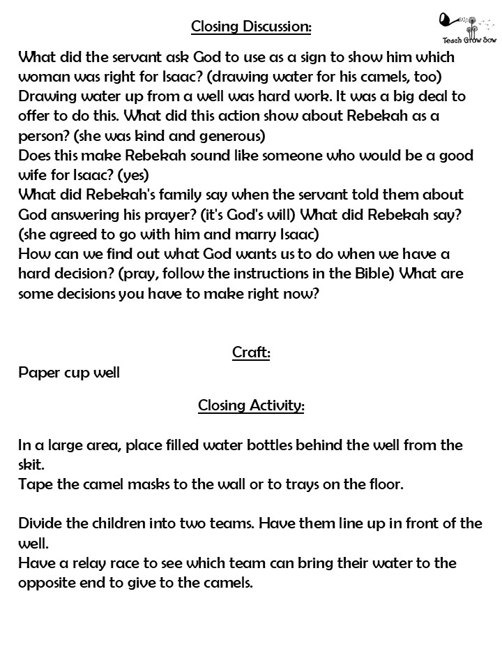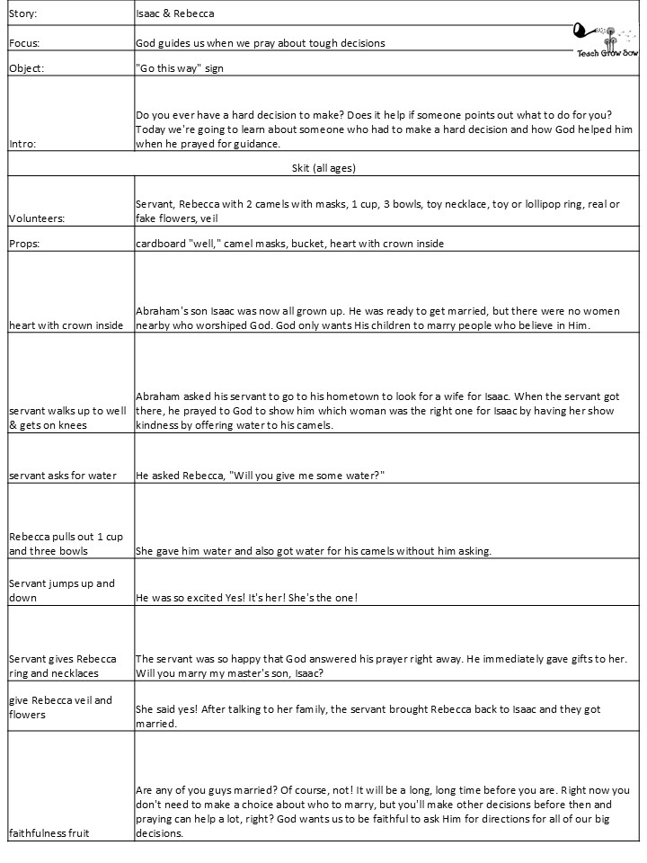 The servant did the best thing to do when making a decision. He prayed. “Lord, please keep your promise to Abraham and help me find a wife for Isaac today. When the young women of the city come to this well for water, I’ll ask one of them for a drink. If she gives me a drink and then also offers to get some water for my camels, I’ll know she is the one you have chosen and that you have kept your promise to Abraham.”