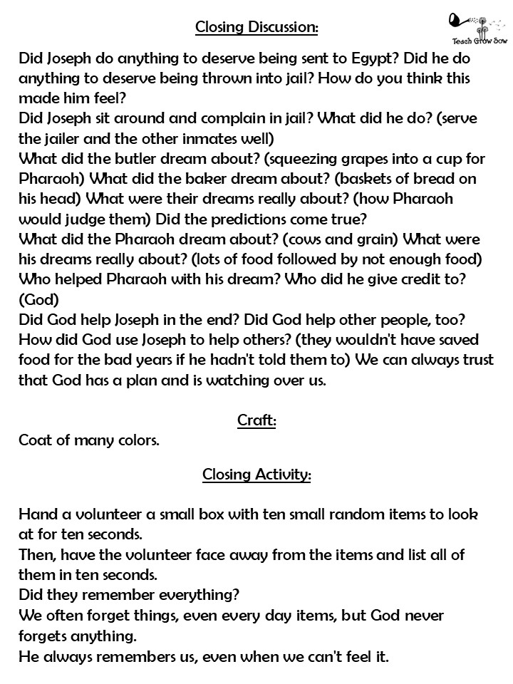 Joseph was sent to Egypt to work for a man named Potiphar. Potiphar liked Joseph and promoted him to be in charge of his house. But Potiphar’s wife got upset with him and decided to tell her husband that he had committed a crime which he hadn’t. Joseph wound up being thrown in prison unfairly. Imagine how this made Joseph feel! Would you still trust in God if after doing the right thing, you still got punished?