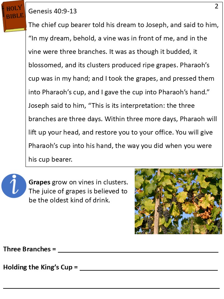 Pharaoh’s butler told Joseph that he dreamed about a vine with three branches. Flowers appeared on it, and then, right away, it had ripe grapes, like watching it grow in fast forward. The butler saw himself squeezing the grapes into Pharaoh’s cup and giving it to him.