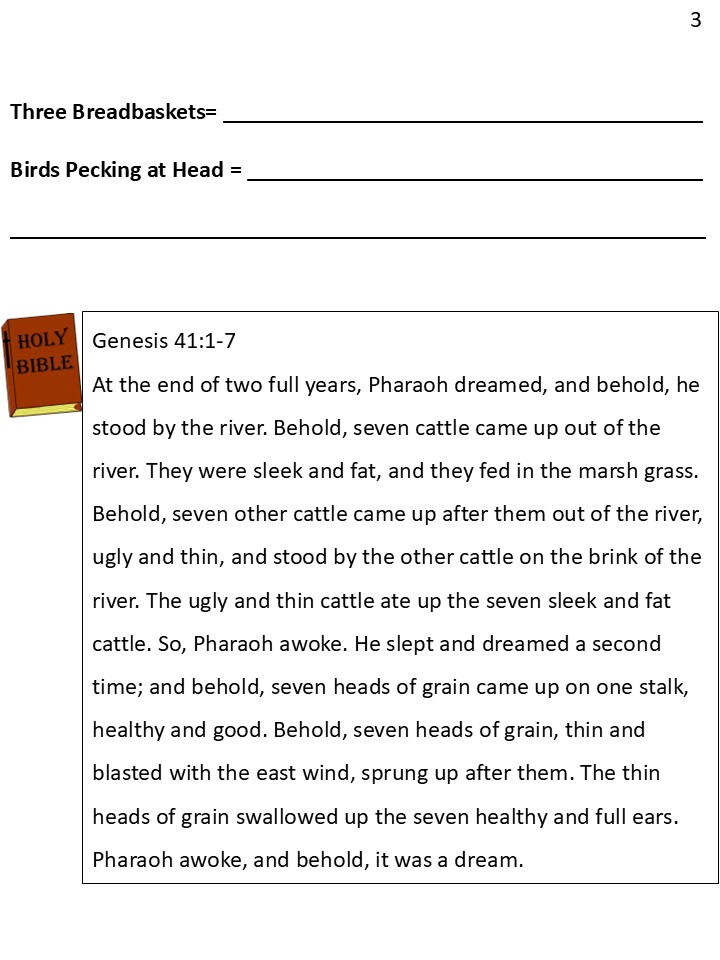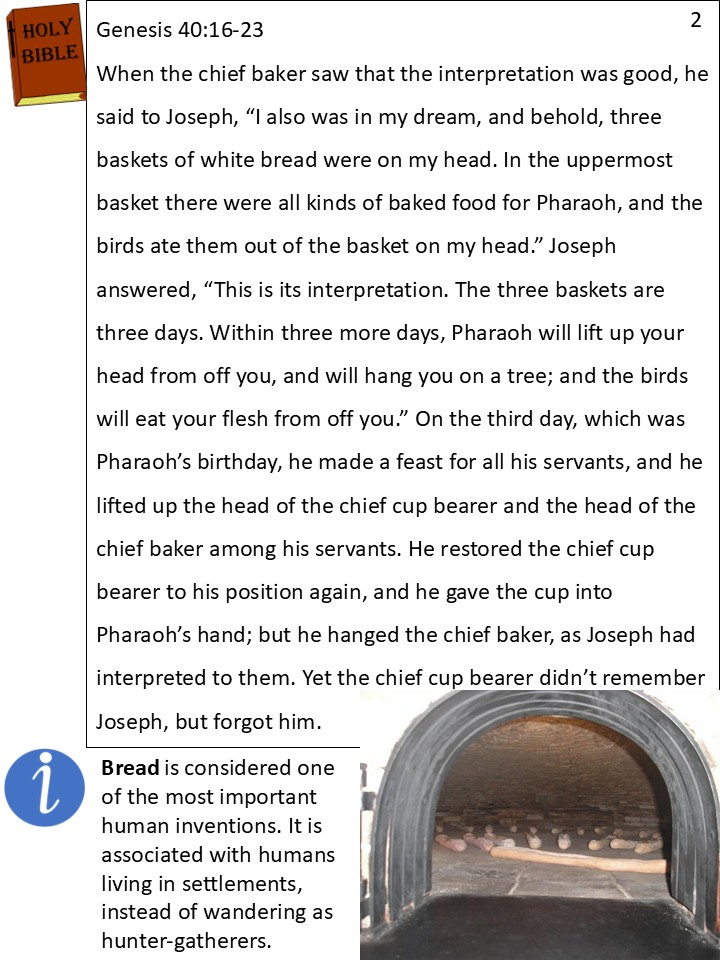 The baker was happy to hear that his cellmate had been given a good interpretation. “I also had a dream,” he told Joseph. “I dreamed that I was carrying three baskets of bread on top of my head to bring to Pharaoh. But birds kept eating the bread.”