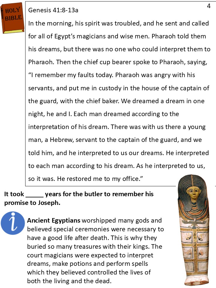 And so, over night, Joseph’s life changed once again. He had to wait many years, but God was still watching over him, and using him to help other people.