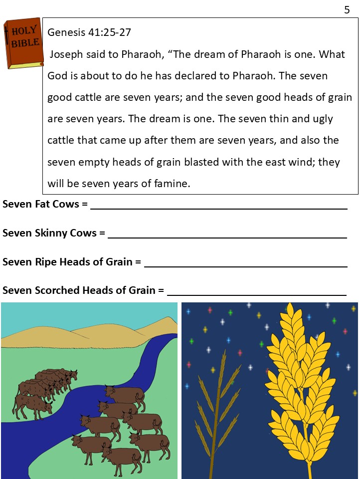 This time he saw a stalk of wheat with seven big heads of grain on it. Then, seven heads of grain that were thin and burnt swallowed the seven big heads. When Pharaoh woke up, he felt afraid again.