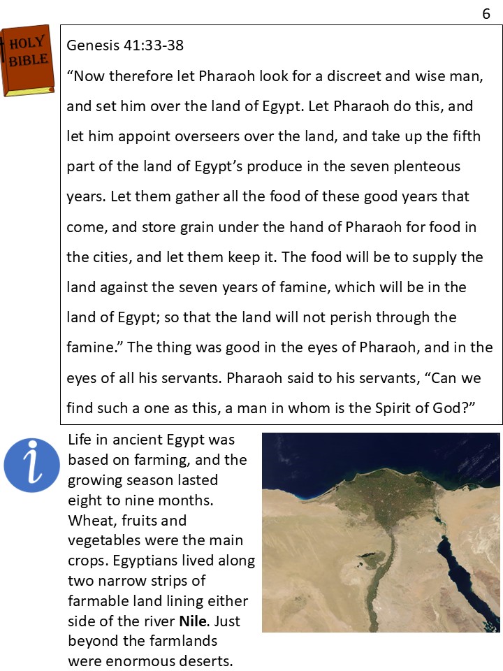 Joseph was brought to listen to the king’s dreams. “Your Majesty,” he humbly explained, “both of your dreams mean the same thing. They are a warning from God. He is telling you that Egypt will have seven years where so much food grows that you won’t even know what to do with it. But after that there will be seven years where food does not grow. You need to put someone in charge of storing up all the extra food so that when the bad years come, the people of Egypt will have enough to eat.”