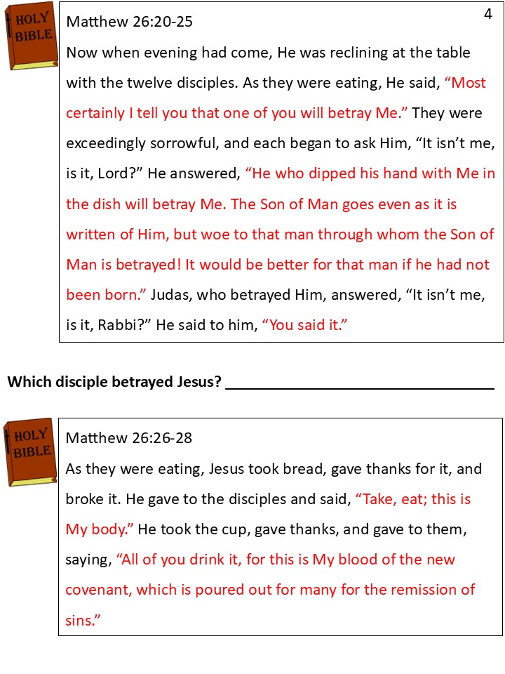 Before this, Judas had gone to the chief priests and asked them, āHow much will you pay me if I help you arrest Jesus?ā The priests were tired of all the attention Jesus was getting and hoped their Roman rulers would take care of Him for them. So they paid Judas thirty silver coins, and Judas began to look for an opportunity to betray Jesus.