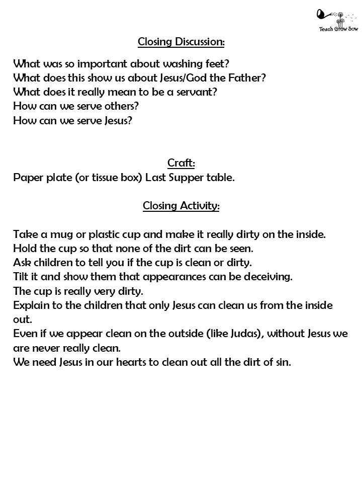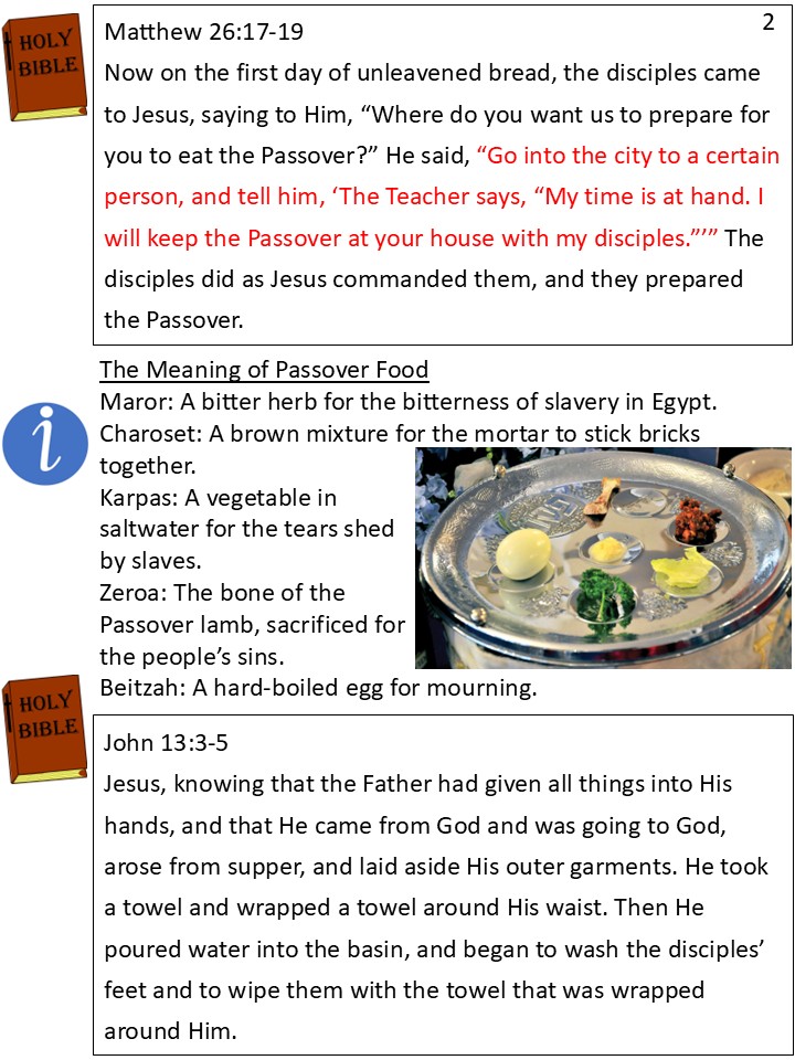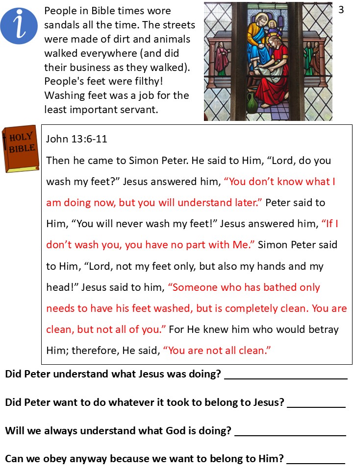Jesus knew that His time on earth was coming to an end. Soon, He would return to His Father in Heaven. While they were eating the Passover meal, Jesus got up, took off His cloak, wrapped a towel around His waist, and poured a large bowl of water. He began washing His disciples’ feet, a job normally done by the least important person in a house.