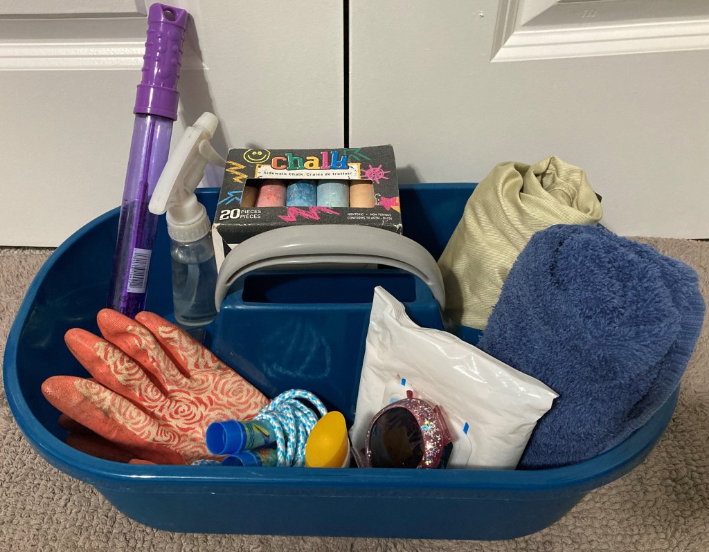 Keep an outdoor tote filled with bubbles, chalk, a jump rope, a small towel for wiping off wet play equipment, sunglasses, sunscreen, kid gardening gloves, hand wipes, mini sanitizer, a small spray bottle filled with water, a small shovel.