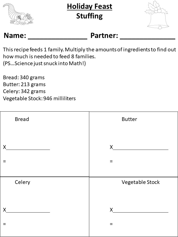 This is a fun project to do with students around the holidays. It includes a rubric and evenly difficult problems for 10 pairs of students. However, for a non-graded project, you may want to ask children to bring in a family recipe, and then have them trade and multiply to feed the whole class.