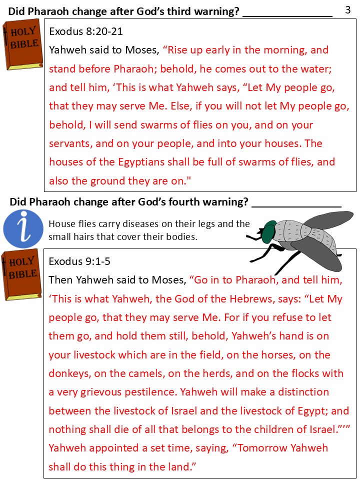 Again, Moses told Pharaoh, “The Lord God of the Hebrews commands you to let His people go, so they can worship Him. If you keep refusing, he will bring a terrible disease on your horses and donkeys, your camels and cattle, and your sheep and goats.”