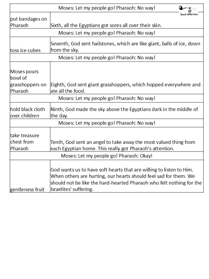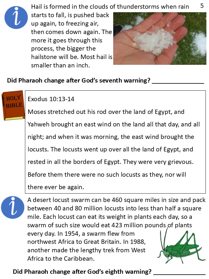 After Pharaoh still refused to let God’s people go, Moses pointed his walking stick toward the sky, and hailstones started falling everywhere. Thunder roared, lightning flashed and everyone ran for cover.