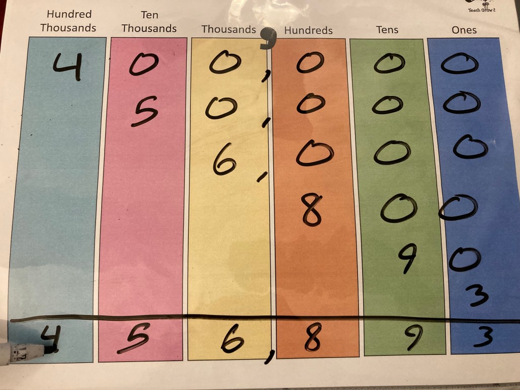 Print this place value template and place in a plastic sleeve for children to write in numbers and color boxes with a dry-erase marker: