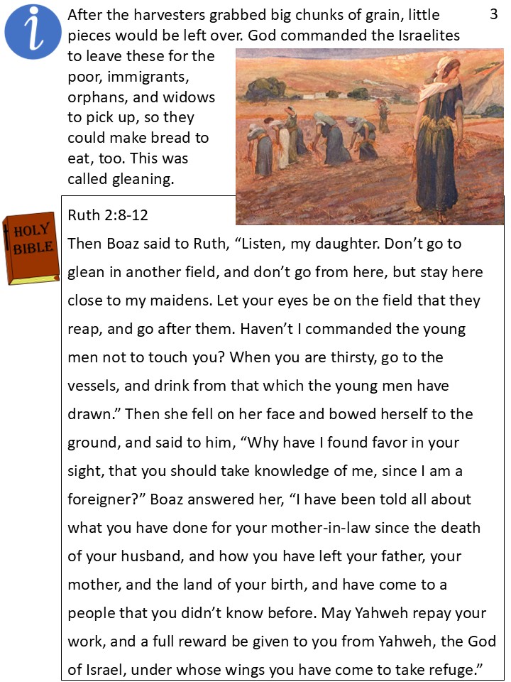 Under God’s laws, Israelite farmers would not take every bit of grain from the fields. Whatever they couldn’t gather in big scoops had to be left for poor people and immigrants to come and get. God made this law so that no one would ever go hungry.