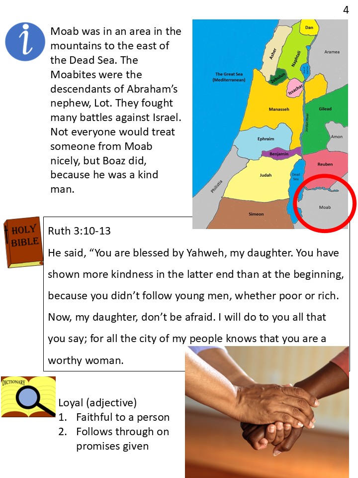 In the days of the judges, there was an Israelite family from the town of Ephrath, also known as Bethlehem. Elimelech and his wife Naomi had two sons, Mahlon and Chilion. They farmed their land year after year, until one year the crops just wouldn’t grow. There wouldn’t be enough food to feed their family. So, they immigrated to the neighboring country of Moab. The Moabites and the Israelites had not always gotten along, but when times are difficult, people must make difficult choices.