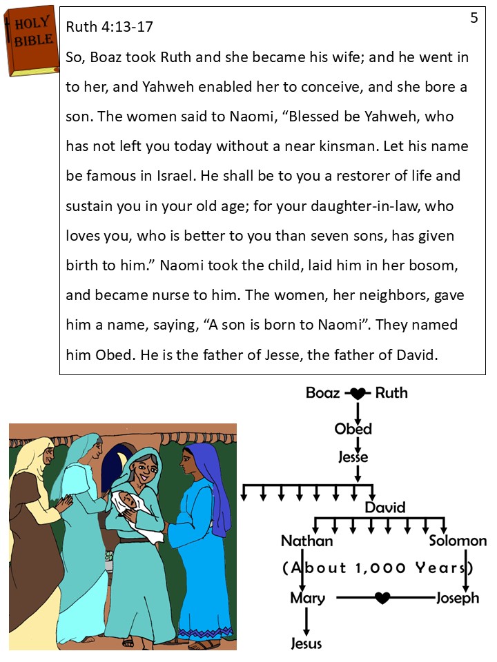 All of Naomi’s friends in the neighborhood called Obed, “Naomi’s Boy,” because she took care of him like he was her own son. “You have been so blessed by God,” they told her. “You have a beautiful grandson, and a daughter-in-law who loves you more than seven sons all put together!”