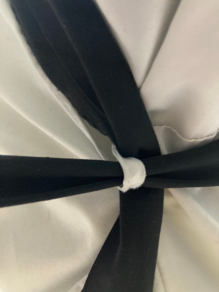 Next, pull the RIGHT ribbon through the LEFT slit, then pull the LEFT belt of the robe through that ribbon.