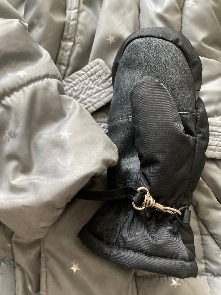 If you don’t want to wash the mittens and jacket together, sew a hook to the end of a strong ribbon and attach it to the sleeves. Sew loops onto the mittens. This way, they can be unhooked for the laundry, but are still strongly attached.