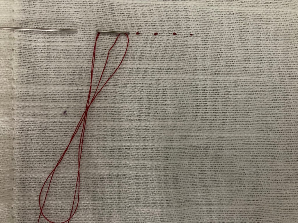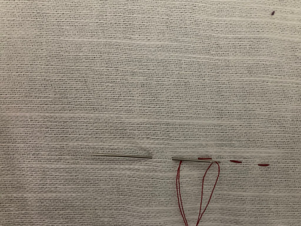 For an area where you want the stitch to go unnoticed, use an “invisible” stitch. Choose a thread as close to the fabric as possible (I am demonstrating here with contrasting colors for greater visibility). Push the needle on the underside about a centimeter, then on the topside only a couple thread lengths.