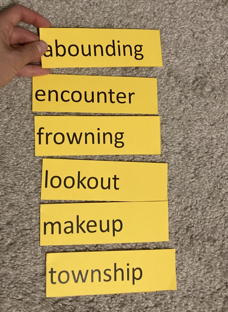 Bring students to the rug with the list of words. Divide them among students. Ask, “Who has words that make the /ow/ sound spelled OU?” All those students bring their words up and place them in a column. Continue with each spelling pattern, also leaving a column for rule-breakers.