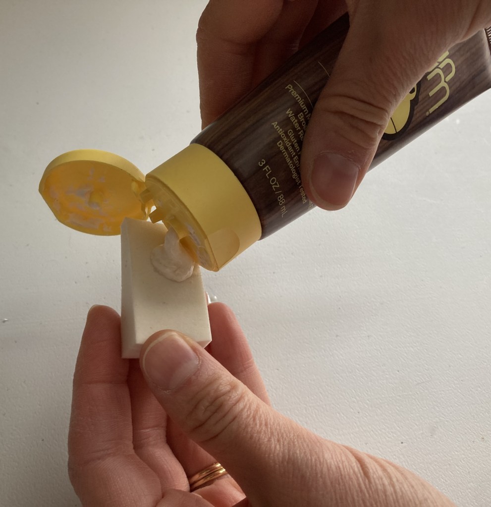 Struggling to get sunscreen onto wiggly babies and toddlers? Put some onto a makeup wedge, and then blend it in. It will spread out much more smoothly than with your hands.