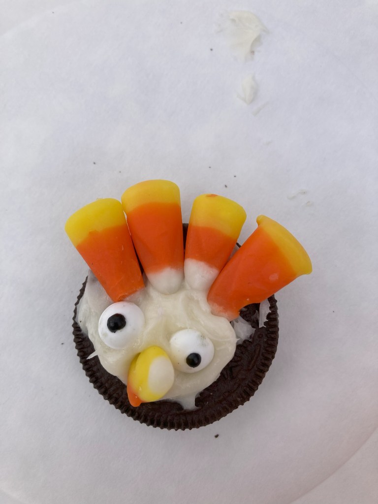 Give children sandwich cream cookies, icing, candy corn, and candy eyes to create their own edible turkeys.