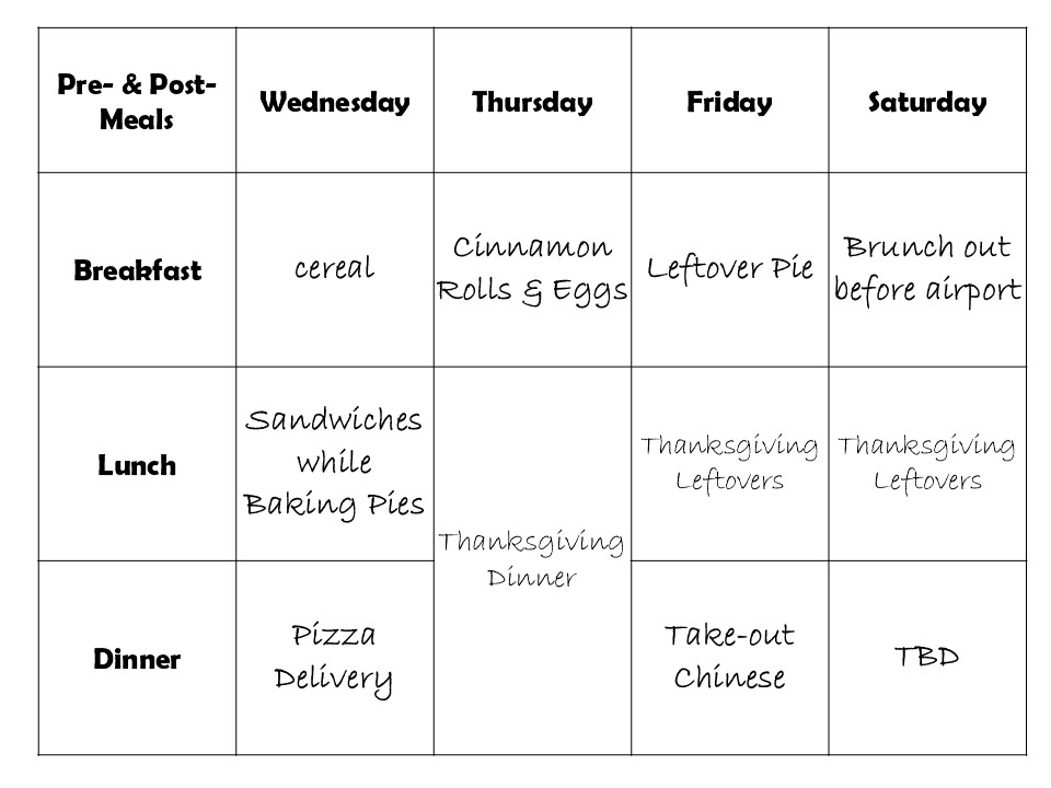 Don’t forget to plan what you’ll be eating in the days before and after Thanksgiving. You may have an overstuffed fridge that won’t allow any non-Thanksgiving groceries to fit for a day or two before. You might easily find yourself skipping a meal while cooking if you don’t plan what you’ll eat. And make sure you have all your leftover containers ready to go.