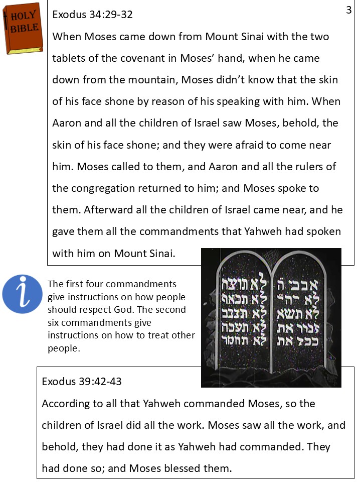 While speaking with the Lord face to face at the top of Mount Sinai, Moses’ face began to shine from God’s presence. After Moses received the two new stone tablets with God’s writing, he began the long walk down the mountain again. When he reached the bottom, there were all the Israelites, eagerly waiting for him. The looks on their faces told him something had happened. Turning to his brother Aaron, he saw that he too looked at Moses with a shocked expression. At first the people were afraid to come near Moses because his face glowed so brightly.