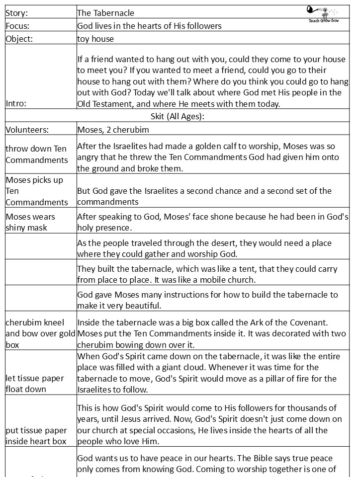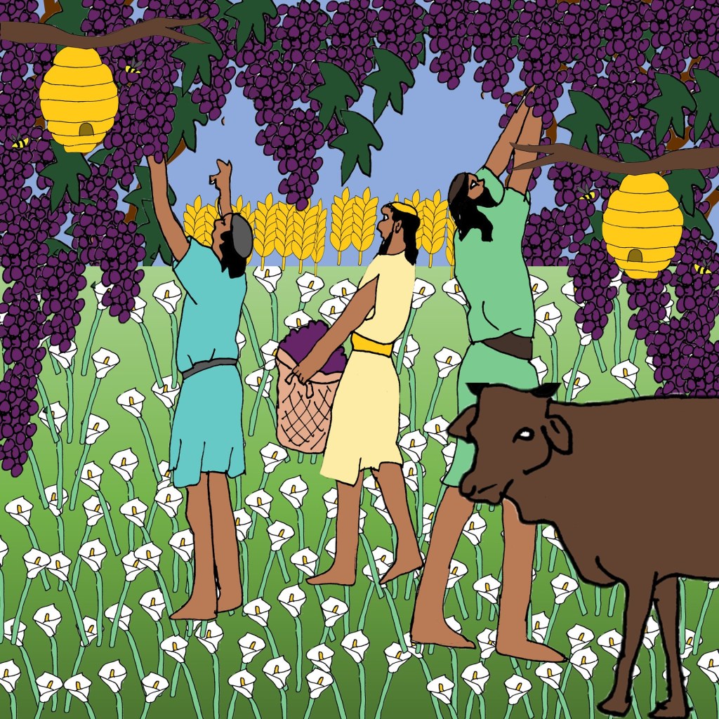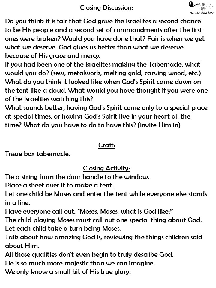 God gave instructions for the artists among the Israelites to create a beautiful tent, called the tabernacle, that would travel with the Israelites, like a mobile temple. Inside of it would be a special box, called the Ark of the Covenant. Inside of the Ark Moses put the Ten Commandments, some of the Manna and Aaron’s walking stick, which God had made to bloom with flowers. God would meet His people here and guide them along their way.