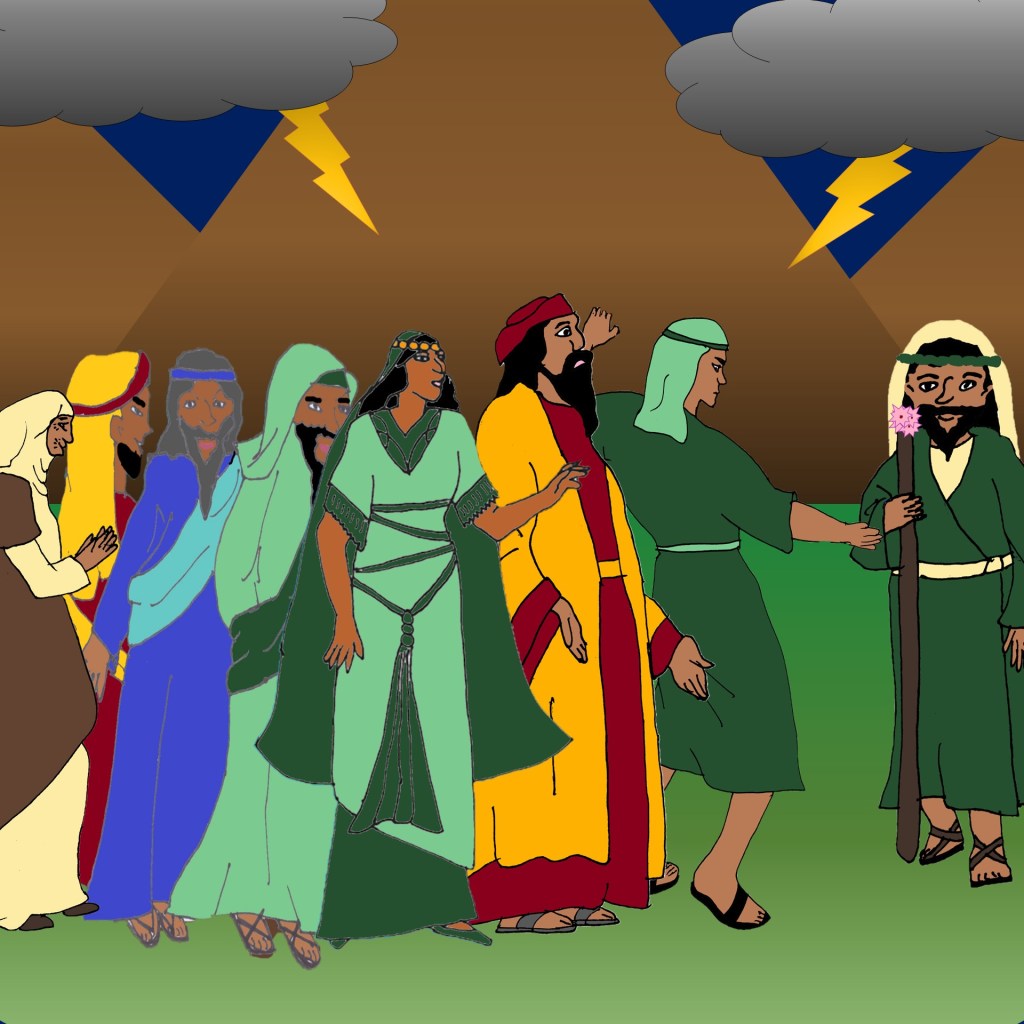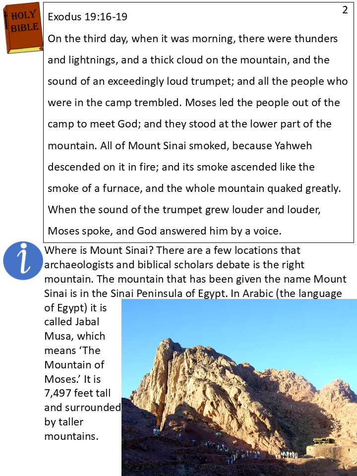 Two months after leaving Egypt, the Israelites arrived at the desert near Mount Sinai, and set up camp at the foot of the mountain. Moses climbed the mountain to meet with the Lord God and hear His message.