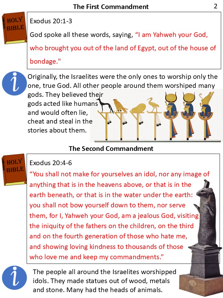 “Don’t carve statues that look like anything on earth,” God continued. “Don’t bow down to statues and pray to them.”