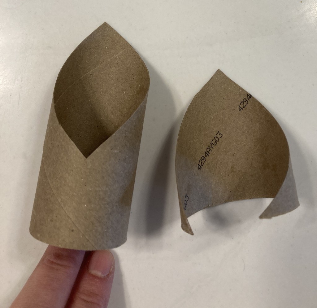 Cut toilet paper rolls at an angle to have a sharp point in back (about 3″ long) and a sharp dip in front (about 2″ long).