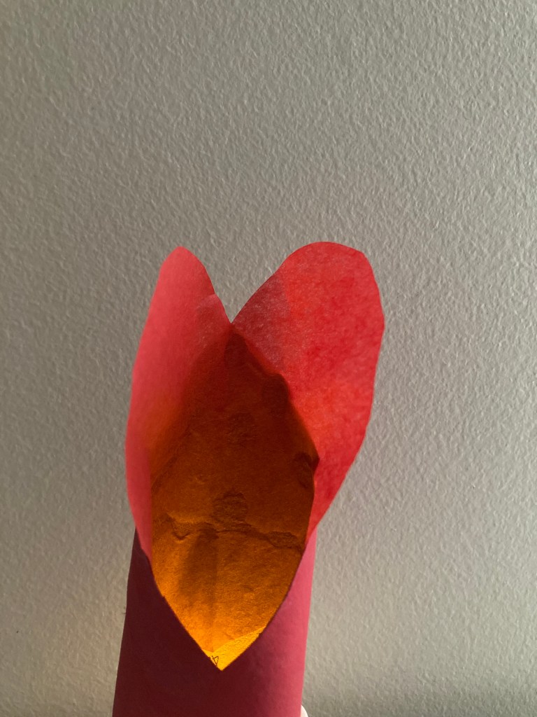 Glue the tissue paper heart on the inside of the toilet paper roll.