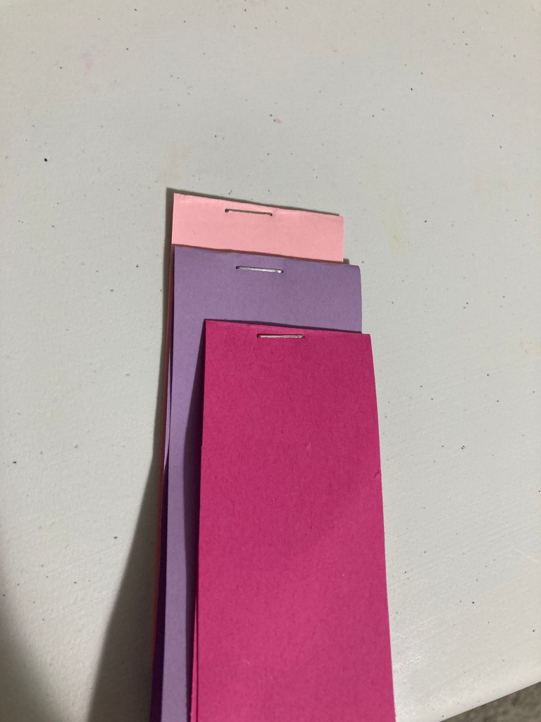 Cut three pieces of different colored cardstock into 2 1″-thick strips of 4″, 5″, and 6″-lengths.