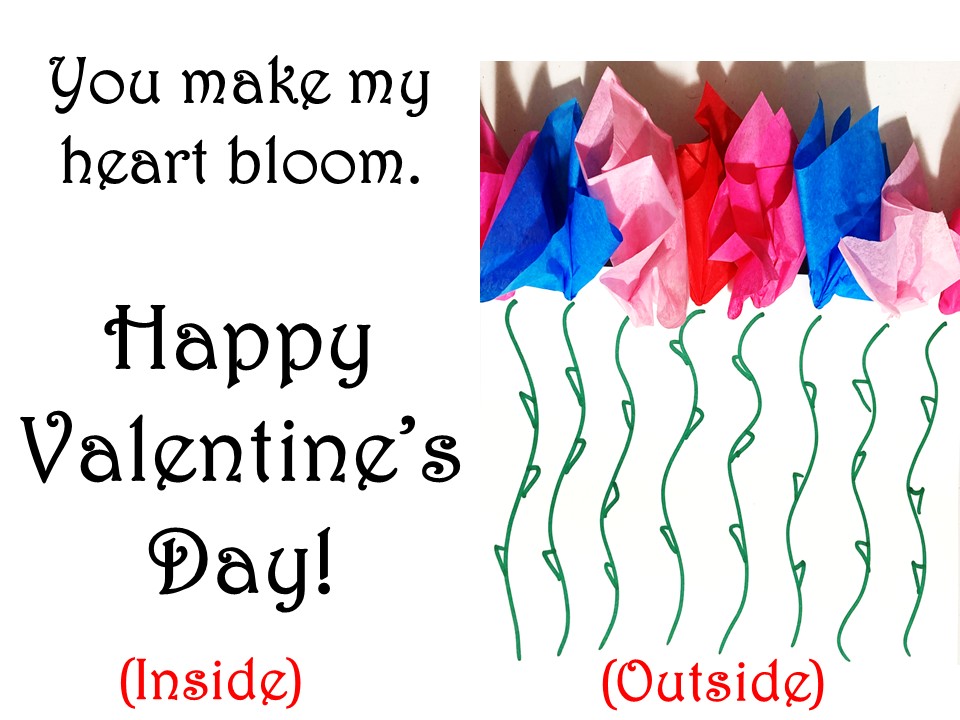 Print this page on cardstock and punch holes at the top of the page, about 1.5 inches apart. Draw stems and leaves from the bottom to each hole. Cut tissue paper into 3″x3″ squares and pull through each hole, taping in the back.