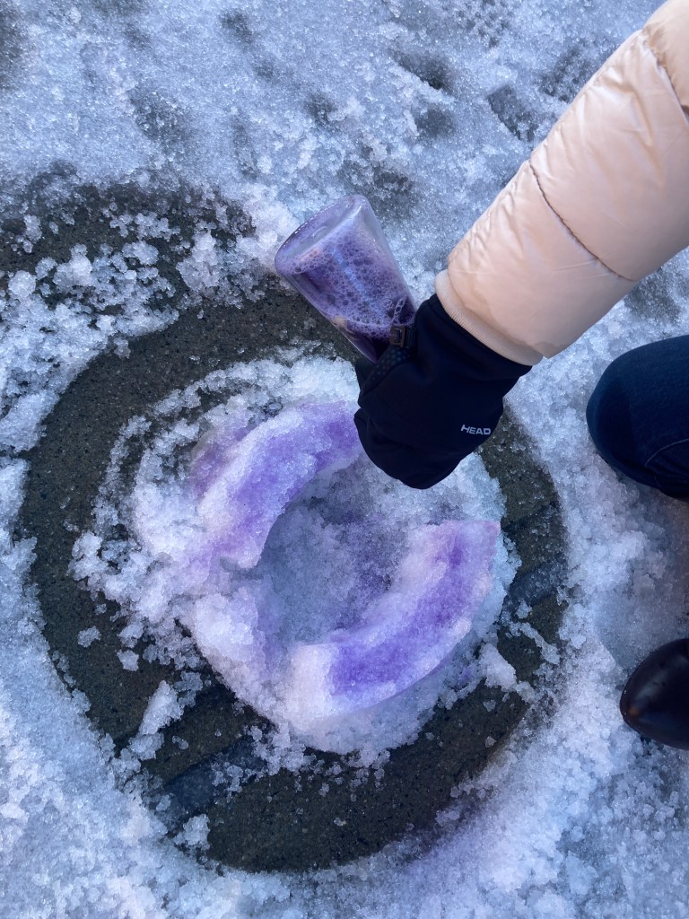 Also, mixing bowls work well for collecting snow because they’re metal, so won’t break if they get knocked over by the wind, and often have a wide, flat (and sometimes rubber-covered) bottom that won’t tip easily.