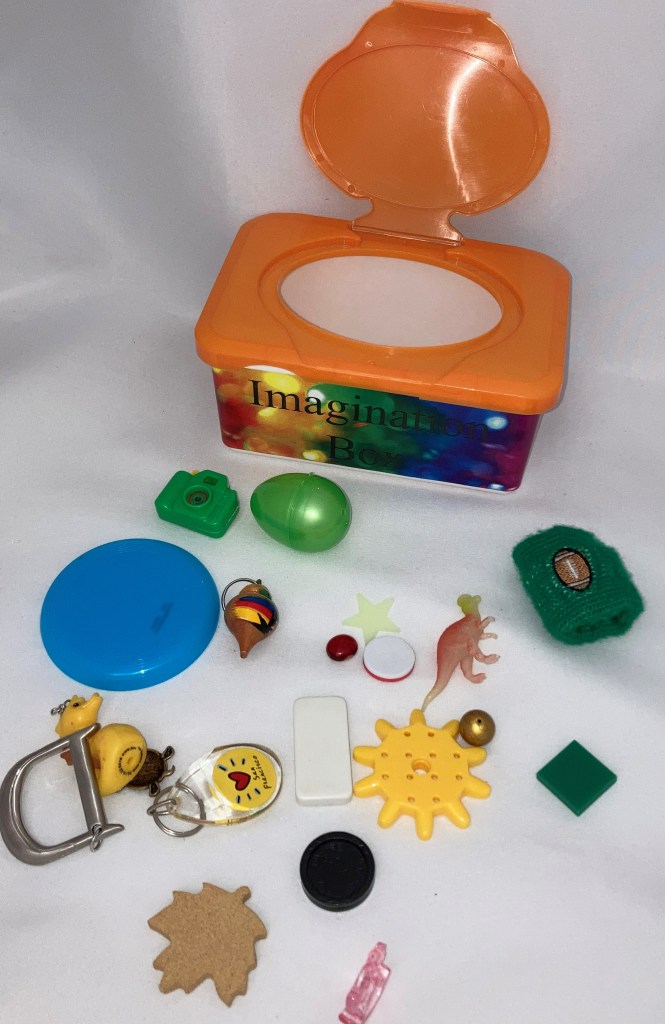 Fill a box (an old wipes box with a lid works very well) with random small objects. Have children pull out one item at a time, each one using the item as inspiration to add one sentence to a group story. Each child passes the box on to the next, saying, “And then…”